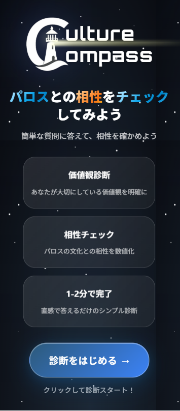 あなたとパロスの 「カルチャーの親和性」 を分析し、分かりやすい相性タイプとして表示するアプリです。